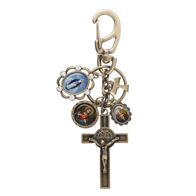 Este chaveiro é uma expressão de fé viva. Ele combina beleza, espiritualidade e tradição, sendo composto por uma cruz detalhada de São Bento, símbolo de libertação e defesa contra o mal, e três medalhas representando Nossa Senhora das Graças, o Sagrado Coração de Jesus e a Sagrada Família, que juntos formam um poderoso sinal de bênção e unidade cristã.