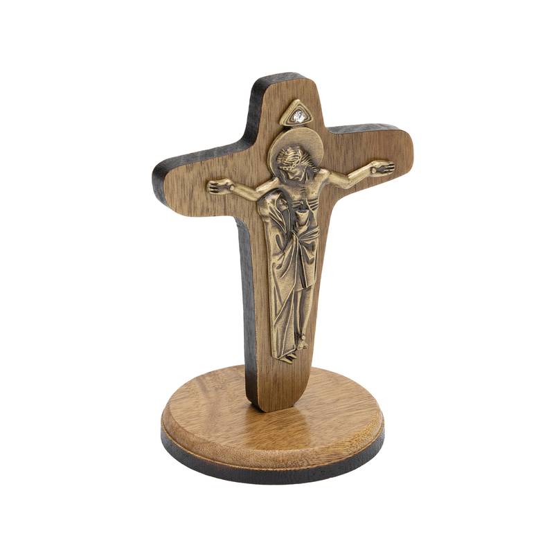 Cada detalhe deste crucifixo reflete essa mensagem: a madeira representa a humanidade de Cristo; o metal, sua divindade eterna; e a luz no topo da cruz, a vitória da ressurreição.