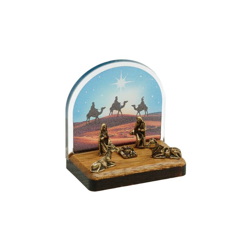 Este mini presépio apresenta a Sagrada Família — Maria, José e o Menino Jesus — em miniaturas metálicas com acabamento dourado, dispostas sobre uma base de madeira natural e sustentadas por um fundo em acrílico transparente, que exibe uma bela imagem dos Três Reis Magos guiados pela Estrela de Belém.