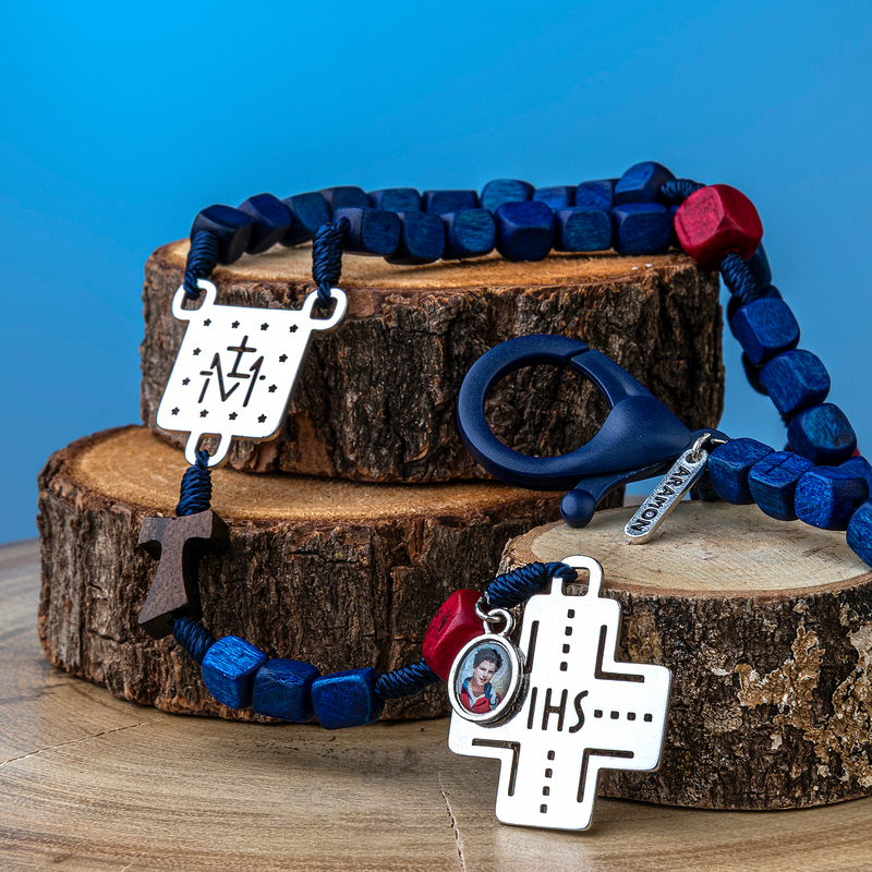 Produzido com contas de madeira natural em formato quadrado de 8mm, com tons vibrantes de azul e detalhes em vermelho, ele reflete o entusiasmo da juventude cristã que Carlo tanto inspirou.
